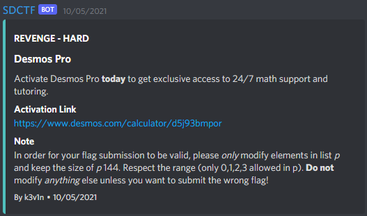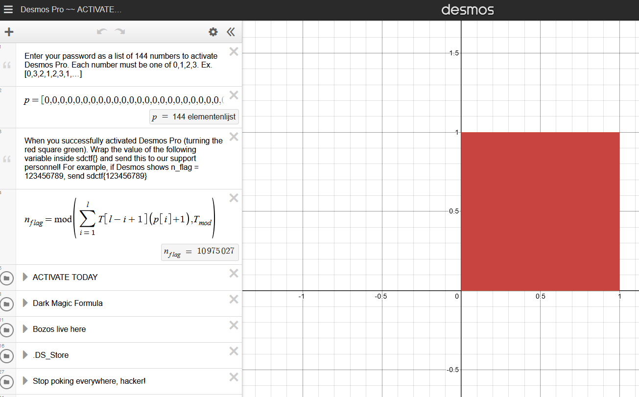 We are linked to an online Desmos file (see link above), where we are greeted by a red square. If we are able to turn the red square to green, we are able to retrieve the flag.