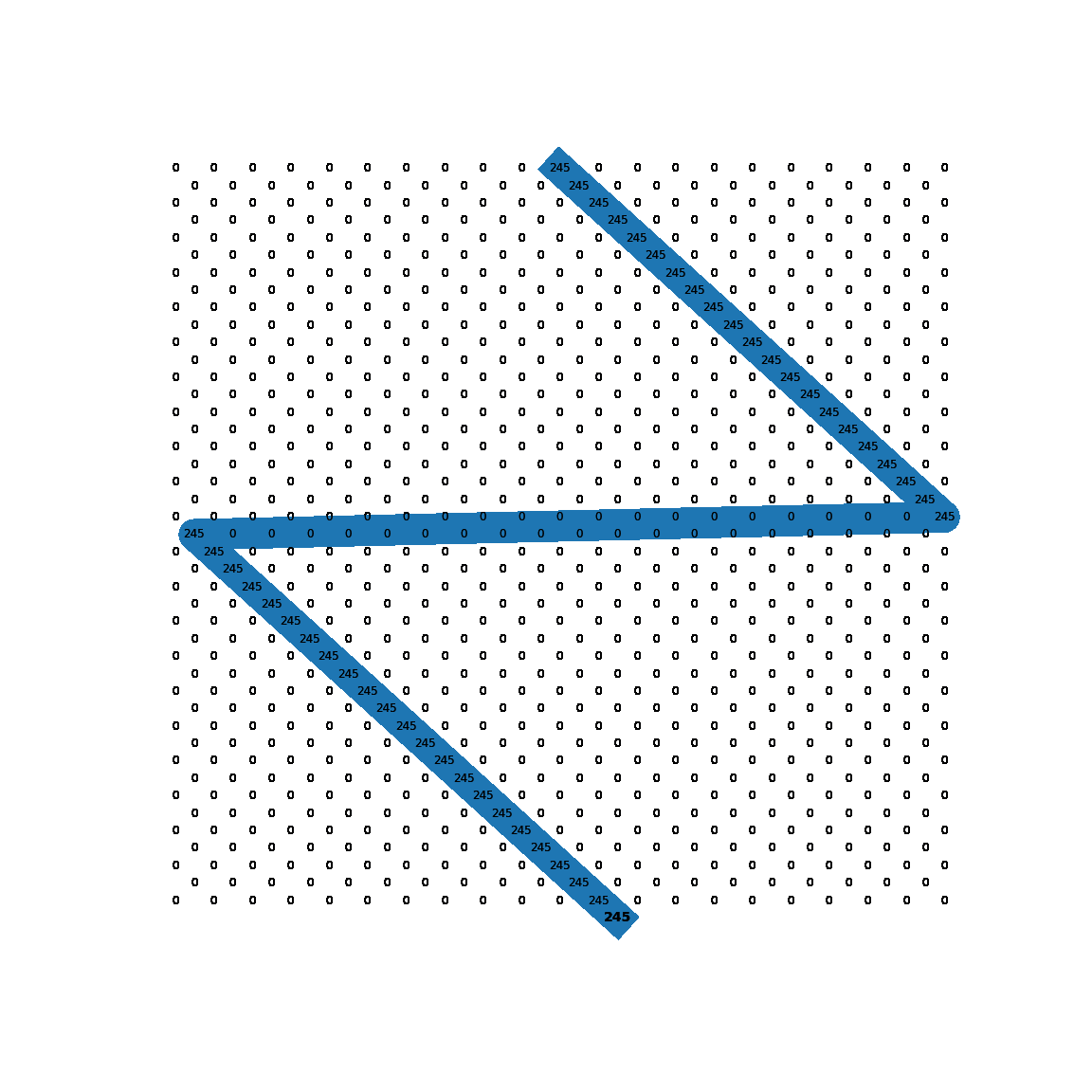This is where the magic happens. The function strike() takes a single byte and runs a loop for 23 iterations. Within this loop it XORs the input byte with the byte in the state array at index ini, which appears to be a global variable (not defined within this function). Both the state byte and the input byte are set to the XOR result before going to the next iteration. Furthermore, the index value ini is adjusted depending on the values of the current input byte and state byte. More specifically, it depends on whether or not the current input byte is smaller or larger than the state byte. Interesting here is to see that the index value ini is modded with 242 at the end of every iteration. Together with the index steps of 10 and 12 and the check for odd row numbers, this suggests we are in fact dealing with a state array that is supposed to mimic some kind of 2D board with interlaced rows of lengths 11 and 10. As our input ‘drops’ through the board it bounces left and right depending on the $<$ and $>$ checks.